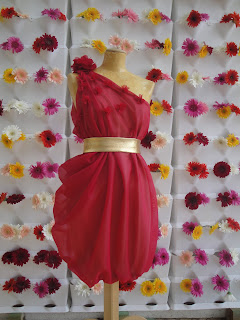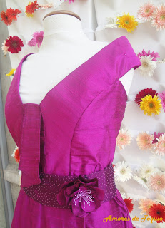 Vestido em seda selvagem rosa fucsia. Gravatinha na frente, cinto forrado com aplicação de flor.
